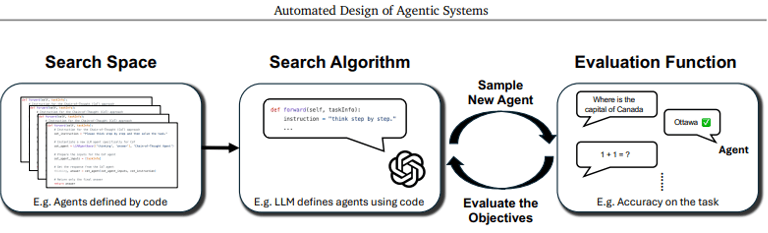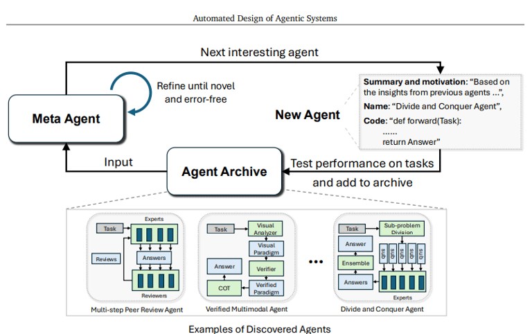 Evaluation and Archiving: Each newly generated agent is evaluated using performance metrics such as success rate or F1 score. The results are stored in an archive, which the meta agent uses to inform future iterations.